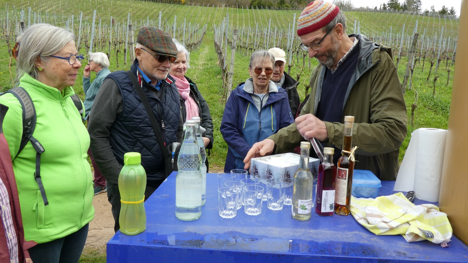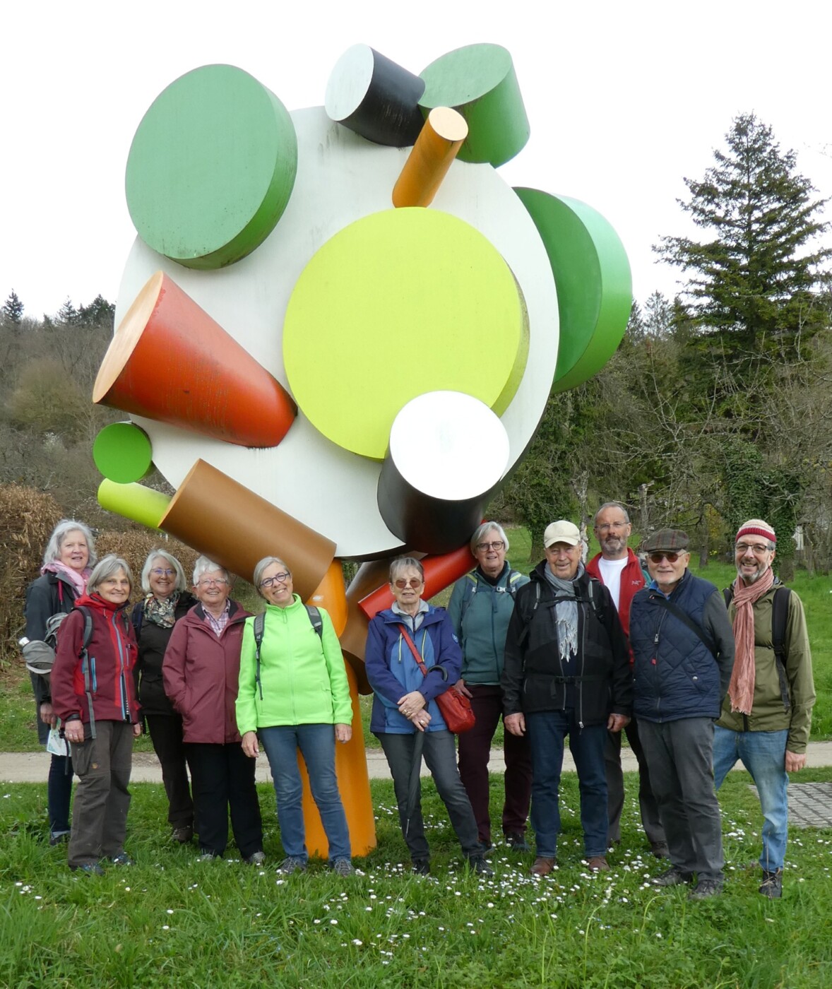 Mit dem Zug fuhren 11 Teilnehmer/-innen bis zum Haltepunkt Dammstraße in LÖ und liefen zur Fondation Beyeler in Riehen, um von dort den „Rehberger Weg“, mit insgesamt 24 Wegmarken des Künstlers Tobias Rehberger, zu starten. Der Weg führt zunächst an die Wiese, über die Wiesebrücke nach Weil-Ost und dann leicht ansteigend hinauf in die Weiler Reben. Bei Station 15 „Brunnen“ legten wir eine Rast ein. Hier öffnete Josef seinen Rucksack und wir staunten, was Josef alles dabeihatte. Er überraschte uns mit zuhause selbst geschmierten Schnittchen, Mineralwasser und 2 verschiedenen Essigzubereitungen (Feigen Aperitif Essig, Schwarze Johannisbeere & Essig) und 1 Zitronenmelissen-Verbenensirup zum Degustieren. Und auch noch die Gläser hat er mitgebracht. „Eine großartige Überraschung“. Weiter ging es auf dem Rebweg bis zur Station 19 „Baum“, wo auch das Gruppenbild entstand. Von hier ging es hinunter zum Vitra Campus mit Einkehr bei Kaffee und Kuchen. Herrliches Wetter lud ein zum Verweilen. Durch den neu angelegten Garten im Campus, vorbei an der Rutsche steuerten wir den Bf. Weil an und mit der S5 direkt zurück nach Steinen. Auch der Frühling zeigte sich schon von seiner positiven Seite. Mit Unterstützung von Ute hat uns Josef eine schöne informative Wanderung beschert. Mit Dank an Beide verabschiedeten wir uns.