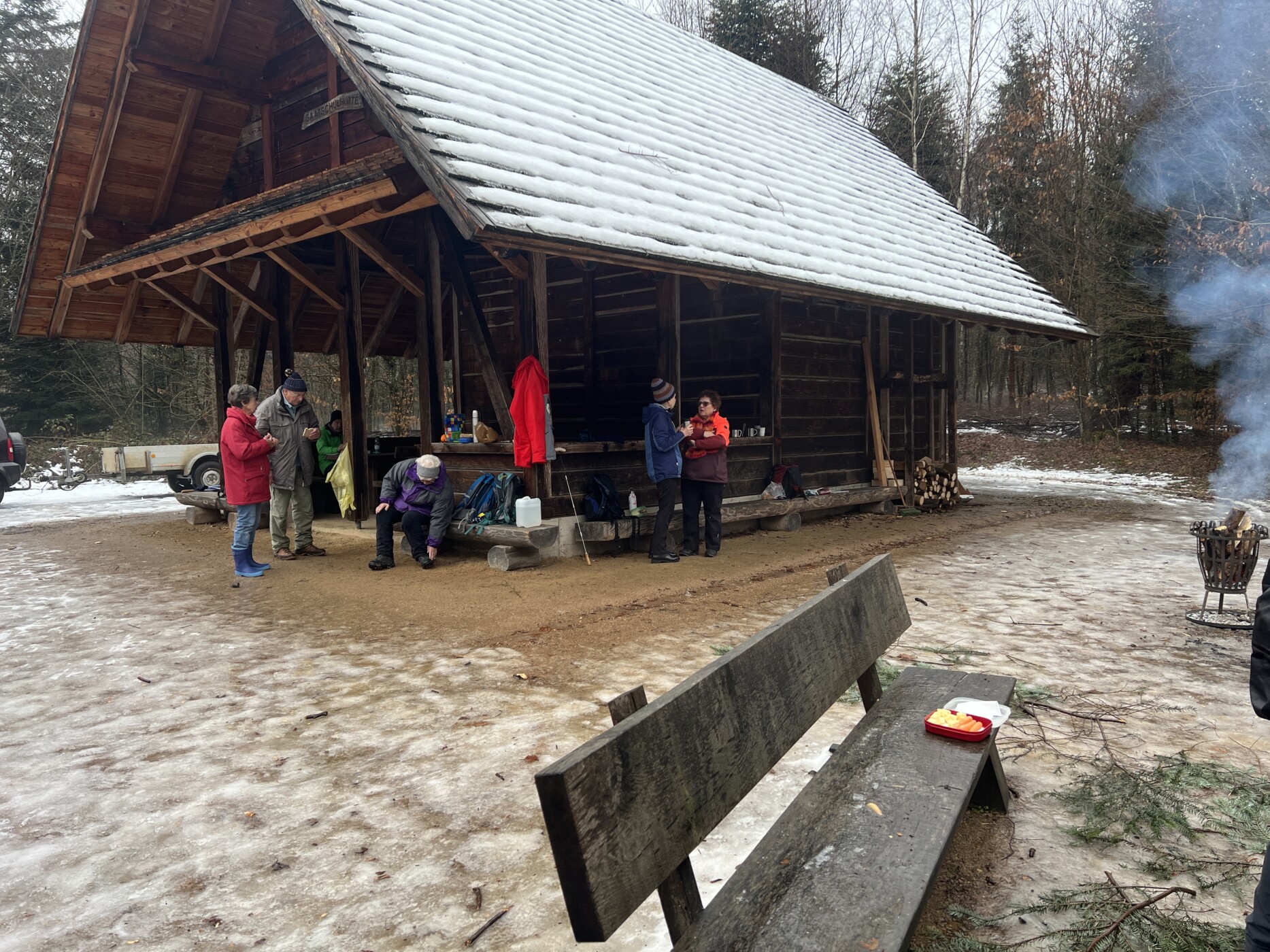 Trotz Regen und teilweise restlichem Glatteis fanden sich eine kleine Schar von Optimisten am Treffpunkt am Steinenbach ein. Auf dem direkten Weg ging es auf der Betonstrasse Richtung Saatschulhütte nach Hägelberg. Dort hatten die beiden Verantwortlichen, Jürgen Hess und Helmut Müller inzwischen ein schönes Feuer entfacht und versucht die Eispritsche um die Feuerstelle rutschfest zu machen. Noch bevor die Wanderer aus Steinen eintrafen, waren schon einige über die Abkürzung „Schöne Aussicht“ eingetroffen. Zum Schluss mussten wir feststellen, dass insgesamt 21 Teilnehmer sich am Grillfeuerversammelt hatten und ihnen die mitgebrachten Grillwürste und der bereits heisse Glühwein gut gemundet hat. Nach netten Gesprächen und besserem Wetter blieb der größte Teil der Teilnehmer bis nach Mittag zusammen, bevor man sich wieder auf den Rückweg machte. Hoffen wir auf ein gutes Wanderjahr mit besserem Wetter als beim Auftakt.